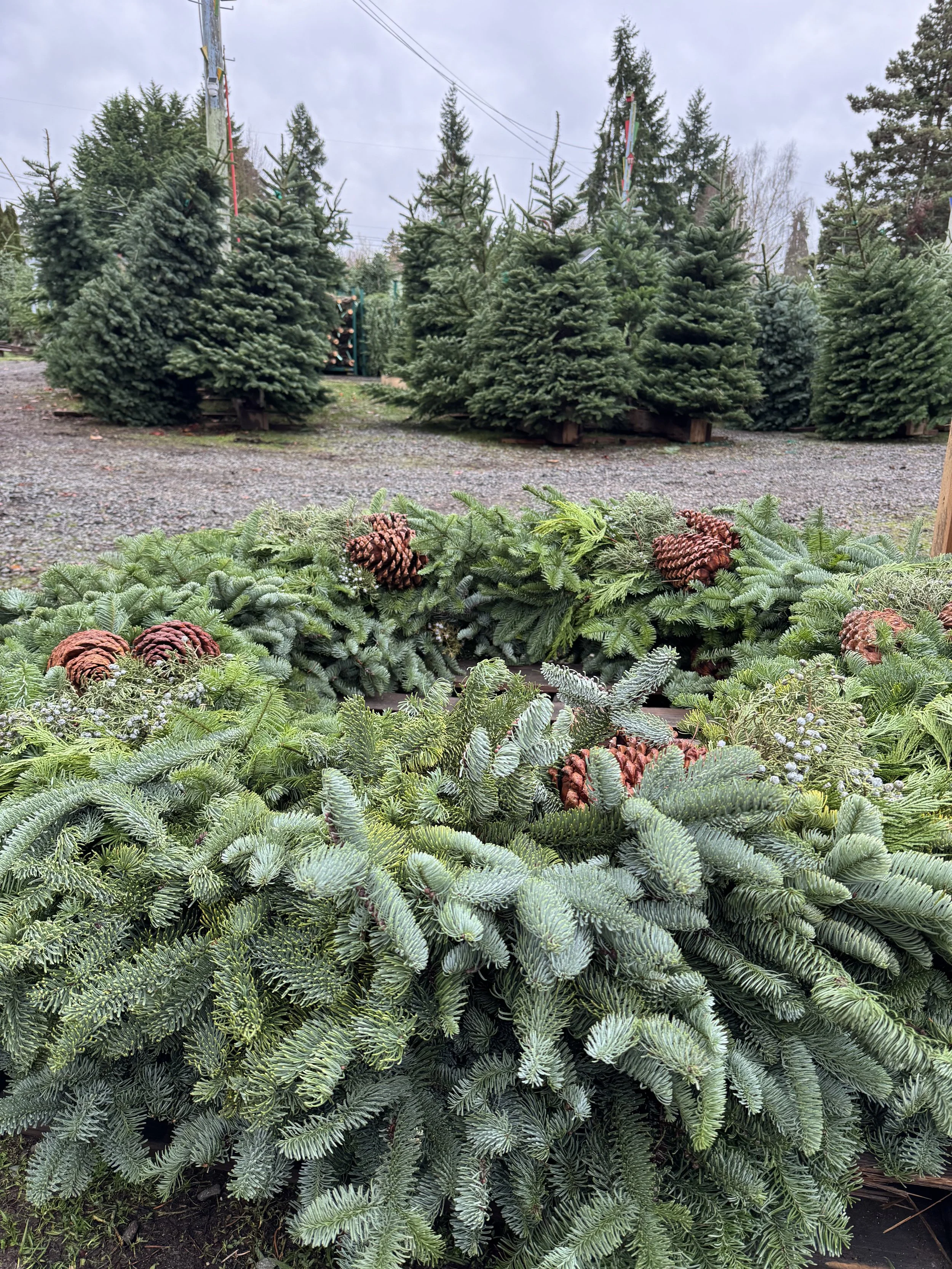 Primarily, we carry Noble Firs, Douglas Firs, and Grand Firs. Occasionally, we have a few Cedars, Pines, Nordmann Firs, and Fraser Firs available.